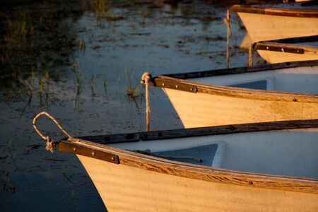 A boats tied to a wooden pier on the lake in the evening at sunset
