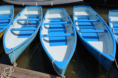 Wooden rowboats with oars inside, moored at the Thames riverside