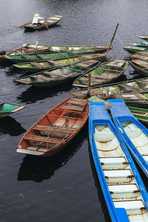 Empty rowing boats stop over the river with a man wearing white shirt and conical hat rowing boat in background at Trang An Grottoes in Ninh Binh, Vietnam.