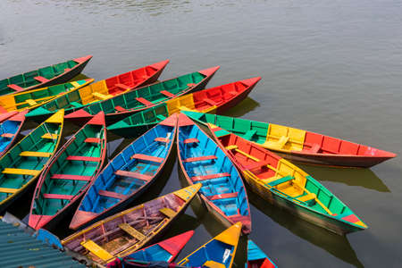 Colorful wooden boats on Phewa lake Pokhara Nepal