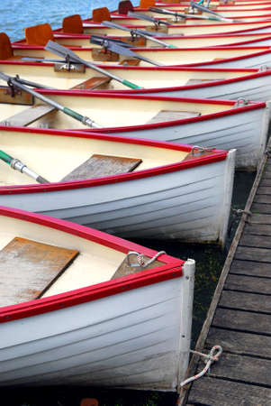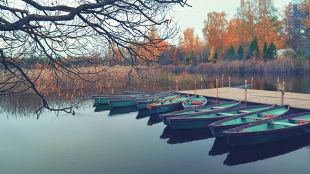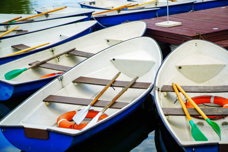Pleasure boats with oars and lifebuoys near the wooden pier on the lake