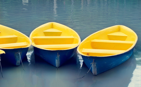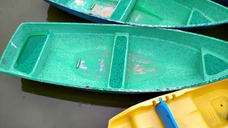 Pleasure boats of green and yellow colors are standing on the pier in the rain. High quality photo