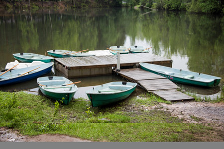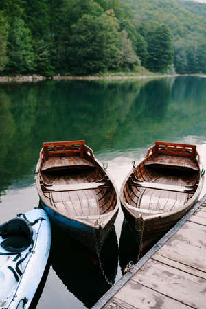 Fishing boats at the pier by the lake in the Biogradska Gora park. Montenegro