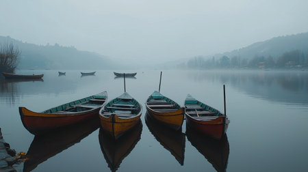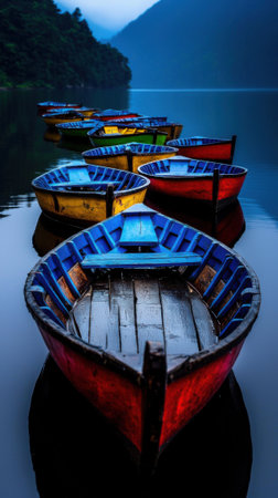 A row of colorful boats are floating on a lake. The boats are of different sizes and colors, including red, yellow, and blue. The scene is peaceful and serene, with the boats reflecting the calm water