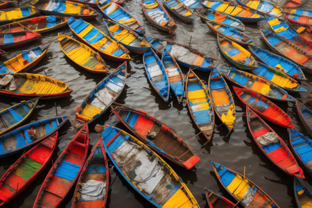 Aerial view of colorful wooden boats lined up on serene water, showcasing a vibrant palette and peaceful atmosphere.