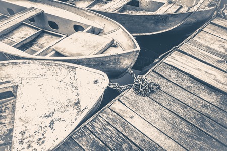 Old iron frayed and shabby boat noses tied to wooden dock close-up