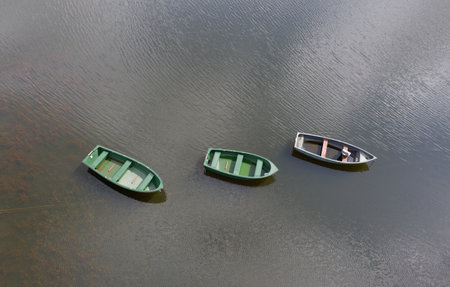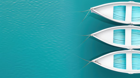 Three elegant wooden rowboats gently float on a serene turquoise surface, creating a peaceful and tranquil scene ideal for nature enthusiasts.