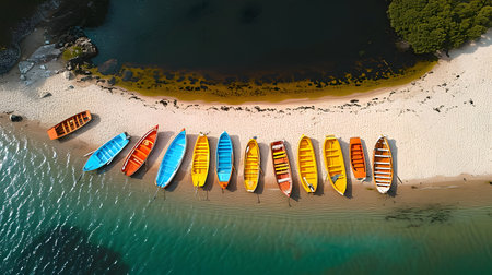A stunning aerial view showcasing an arrangement of vibrant boats floating peacefully on a calm blue water surface, ideal for travel or nature themes.