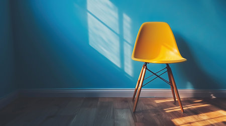 An empty room features a single chair and a decorative object illuminated by warm sunlight streaming through a window. The composition emphasizes the contrast between light and shadow. The image uses a minimalist style and is suitable for various design, advertising, and conceptual projects.