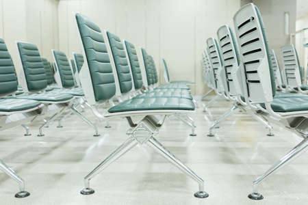 furniture, public places and interior concept - wooden chairs at hospital waiting room