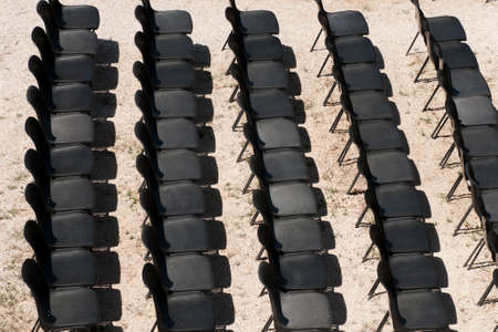 Rows of plastic chairs await passionate fans at the sport stadium, anticipating the thrill of competition. Invest in the excitement of live sports.