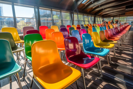 Rows of empty plastic chairs in a spectrum of vibrant colors create a pattern of repetitive modernity.
