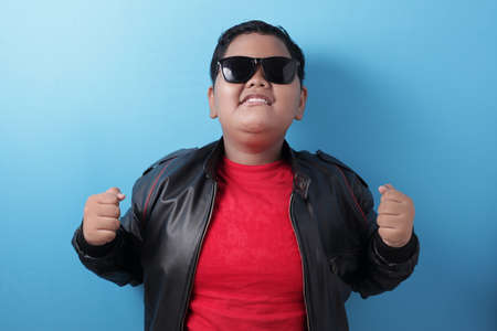 Portrait of happy success smiling fat Asian boy wearing black leather jacket and sunglasses shows confident gesture, celebrating victory, against blue background