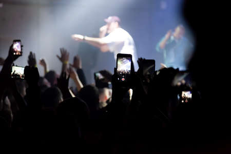 Selective focus of Silhouettes of people holding phones to take pictures at a concert, lights from a performance stage.