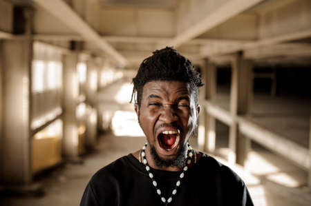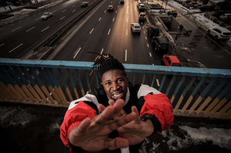 Top view of afro-amercan man rising his hands up and showing stop on the background of the city road