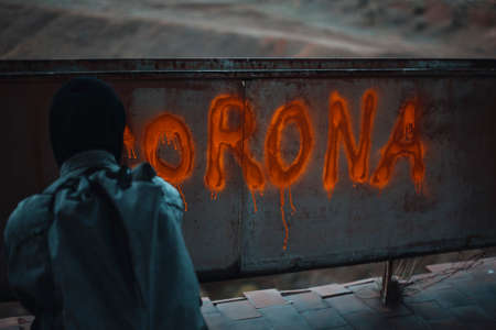Men portrait in a neon light. Beneath in the hoodie and hat. Dark face. Hip-hop style.
