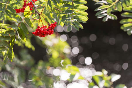 Red berries of mountain ash on a tree in sunny weather