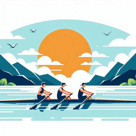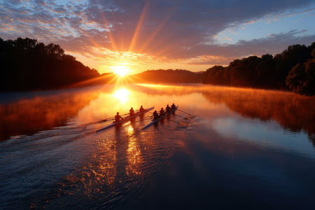 A dynamic scene capturing rowers in perfect synchrony on a serene river during sunset. The warm golden hues reflect on the water's surface, creating a peaceful yet energetic atmosphere.