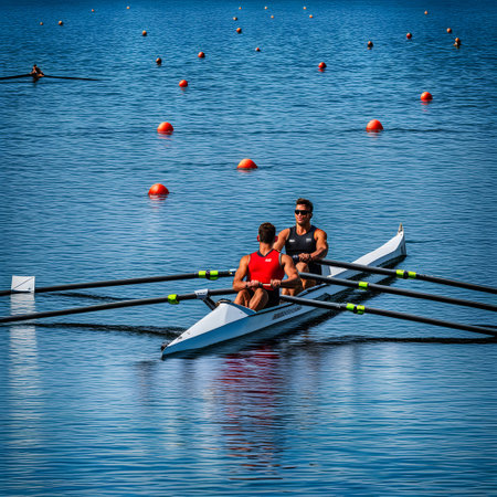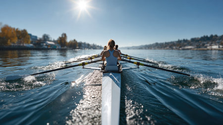 Two athletes row in harmony on a calm lake, their synchronized movement creating ripples in the clear water under bright sunlight.