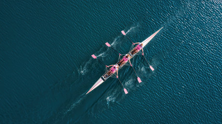 An overhead view displays a rowing crew on a body of water. The composition highlights the boat and oars creating lines and textures against the blue water. The lighting is natural, suggesting outdoor conditions. This imagery is suitable for editorial or commercial projects representing teamwork and sports.