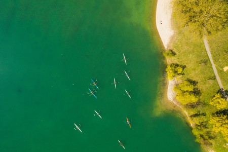Water sport, panoramic aerial view of kayaks on lake from drone, overhead view, unrecognizable people paddling on beautiful green lake Jarun, Zagreb, Croatia