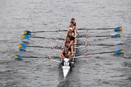 BOSTON - OCTOBER 23: South Niagara Rowing Club youth men Eights races in the Head of Charles Regatta. Marin Rowing Association won with a time of 15:06 on October 23, 2011 in Boston, MA.