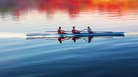 Synchronized Rowing at Sunrise Teamwork and Grace in a Serene Natural Setting on Calm Water