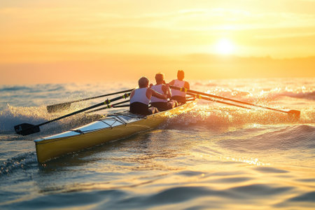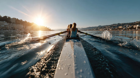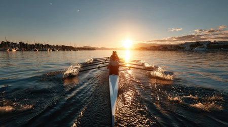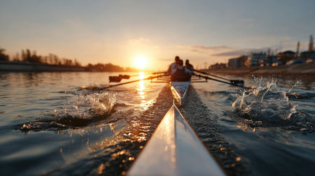 A striking image portrays a rowing team gliding gracefully across tranquil waters at sunset, creating dynamic splashes and beautiful reflections.