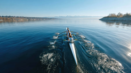 Rowers in sleek boat glide through shimmering blue water, creating ripples in their wake. teamwork and synchronization of crew are evident as they navigate serene environment