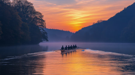 A dynamic rowing team glides through a tranquil lake at sunrise, exemplifying teamwork and athleticism amidst stunning natural beauty and vibrant colors.