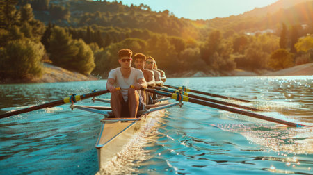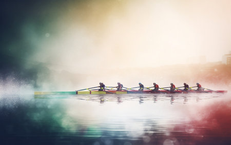 A rowing team glides down the calm waters of a river in perfect unison created with Generative AI