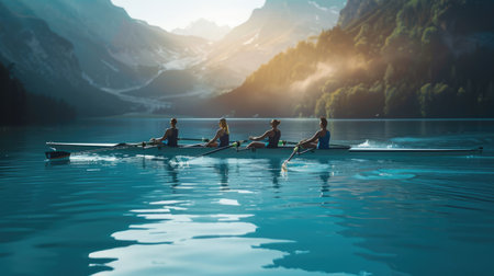 Early Morning Rowers Team Working Together on a Calm Lake at Sunrise, Embracing Sport and Serenity