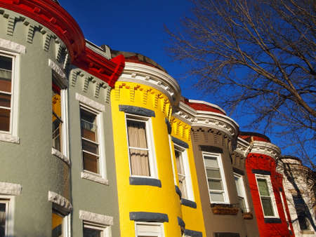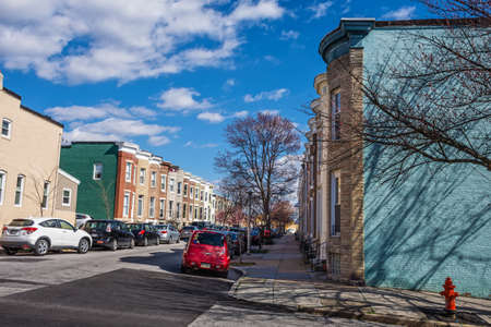 BALTIMORE, MARYLAND - MARCH 3: Colorful row homes in this Hamden neighborhood on March 3 2017 in Northern Baltimore.