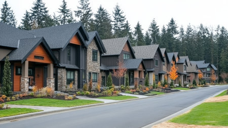 This image captures a row of modern houses showcasing stylish architecture, set against a backdrop of lush evergreen trees in a serene neighborhood.