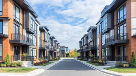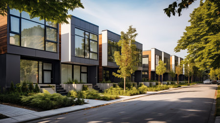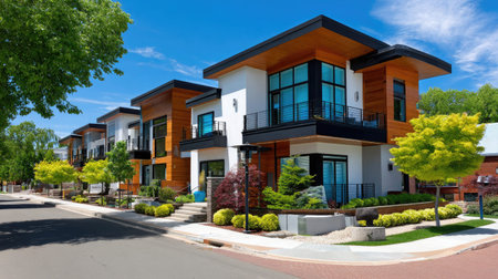 This image features modern residential buildings showcasing clean lines and contemporary architecture set against a picturesque suburban backdrop.