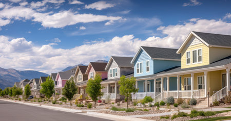 A Line of Pastel Houses Under the Serene Blue Sky, Complete with Picket Fences and Mountain Scenery