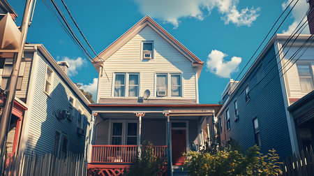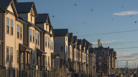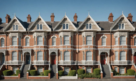 A row of houses is presented under a clear blue sky. The visual characteristics include a symmetrical composition with neutral colors, creating a sense of order. The environment suggests an outdoor setting during daylight hours, with potential applications in real estate or architectural contexts.