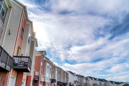 A row of residential townhomes or townhouses in suburb, Concept of real estate development, the housing market, and homeownership