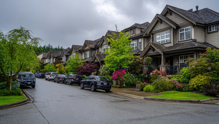 A row of houses lines a street, each with a distinctive design and landscaping. Cars are parked along the curb, suggesting a residential area. The cloudy sky provides even lighting across the scene, highlighting the architectural details. This image could be used for real estate, lifestyle, or design-related content.