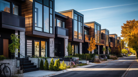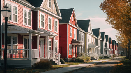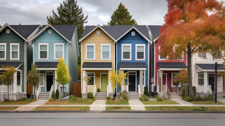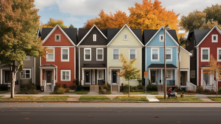 A row of contemporary suburban houses with vibrant facades lined along a quiet street. the colorful homes contrast beautifully with the surrounding autumnal foliage, creating a serene and inviting residential scene. Generative AI