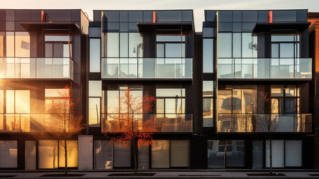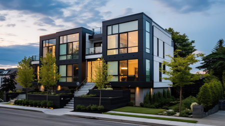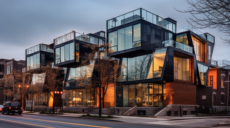 Appearance of residential architecture. Modern modular private townhouses. Residential minimalist architecture exterior. Very modern neighborhood, early morning shot.