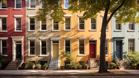 row of townhouses with colorful front doors, taken at street level, created with generative ai