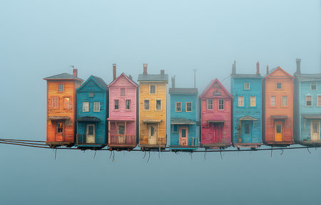 A dreamy landscape featuring colorful small houses suspended on a wire, enveloped in fog. The scene captures a whimsical blend of architecture and nature, creating a serene atmosphere.