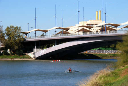 SEVILLE, SPAIN - NOVEMBER 15, 2008 - Rowers along the Guadalquivir river with the Christ of Expiration bridge to the rear, Seville, Seville Province, Andalusia, Spain, Europe, November 15, 2008.