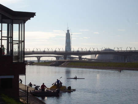 Competition in kayaks. Evening in the park, on the river training kayakers.
