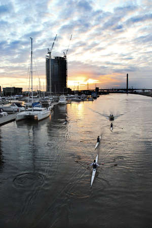 Melbourne, Australia - April 19, 2017: People rowing on Yarra river in the morning with view of Southbank promenade
