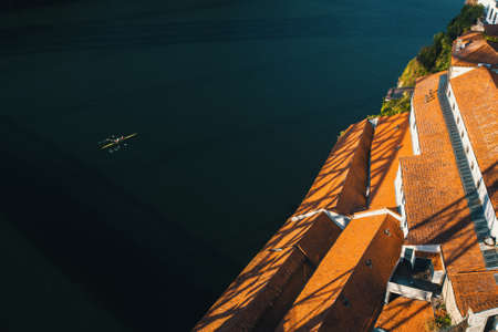 Top view of the Douro river and shore of Vila Nova de Gaia, Porto, Portugal.