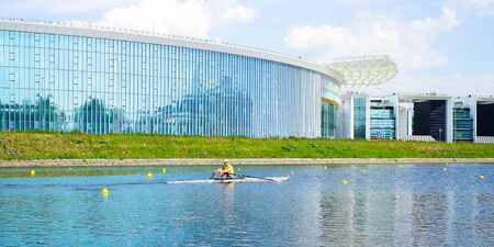 Sportsman single scull man rower rowing on boat at Moscow River Russia