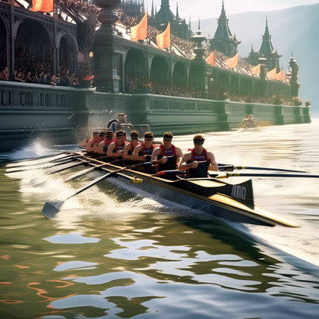 A group of determined rowers in a sleek boat demonstrates teamwork and athleticism while gliding over calm waters. The clear blue sky enhances the serene ambiance.