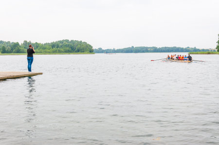 Trakai, Lithuania - July 26, 2013: Photographer standing on pier and making pictures of a floating eight rowing boat with tourists and instructor in the waters of Galve lake